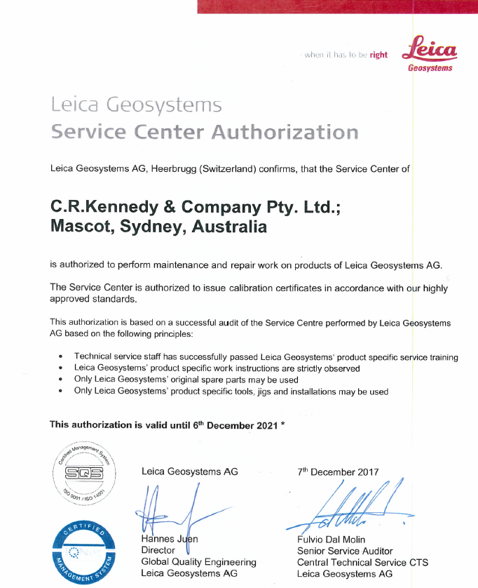 C.R.Kennedy work under guidelines of Leica Geosystems, our service departments are fully authorised by Leica Geosystems and offer full technical support, service maintenance, repairs in accordance to Leica-Geosystems guidelines and ISO9001 / ISO14001 accreditation.